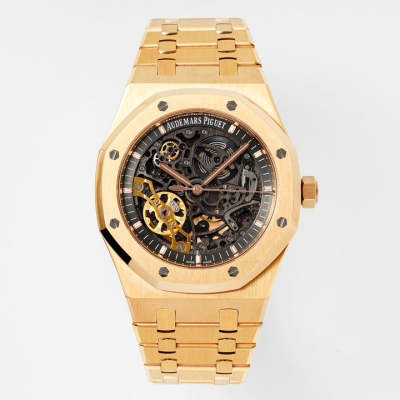 ??Dial??Deep gray hollowed-out dial with rose gold luminescent hour markers and Royal Oak hands. The hollowed-out decoration of the dial. achieved by removing excess material. gives the watch a unique artistic design and architectural style. This is a traditional craftsmanship that demands extremely strict precision. as even the slightest deviation could cause timing errors in the movement or affect its shock resistance. ZF Factory achieves a perfect balance between presenting the intrinsic beauty of the mechanical movement and ensuring accuracy. allowing us to feel the beauty of mechanical operation within the hollow structure.
