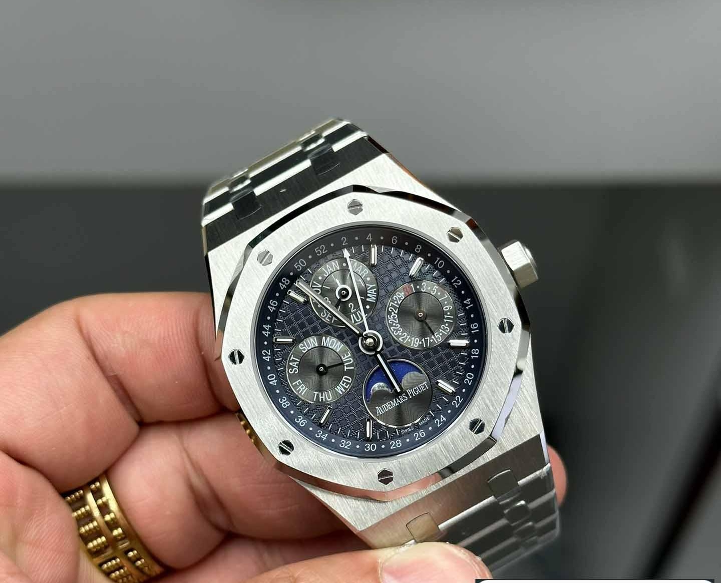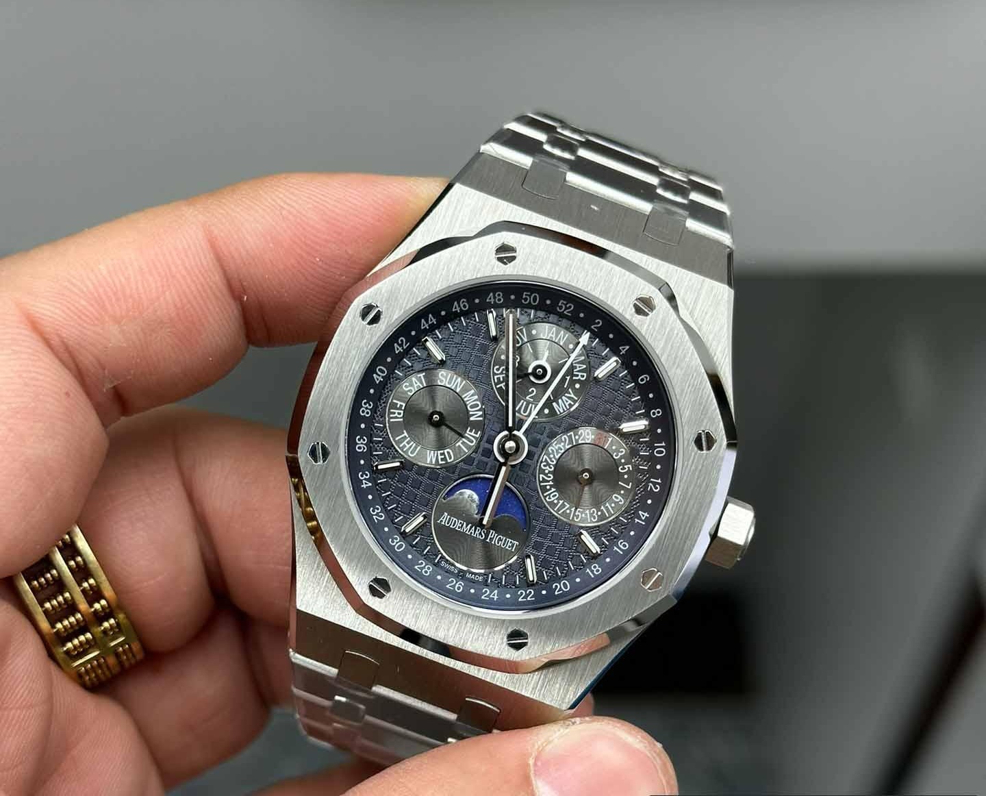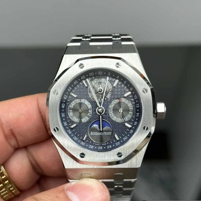 Audemars Piguet Royal Oak series perpetual calendar wristwatch. with its noble and elegant blue dial paired with a striking stainless steel case. perfectly reflects Audemars Piguet’s aesthetic design and the high technology of complex functions.